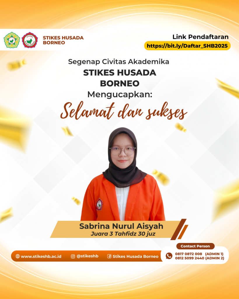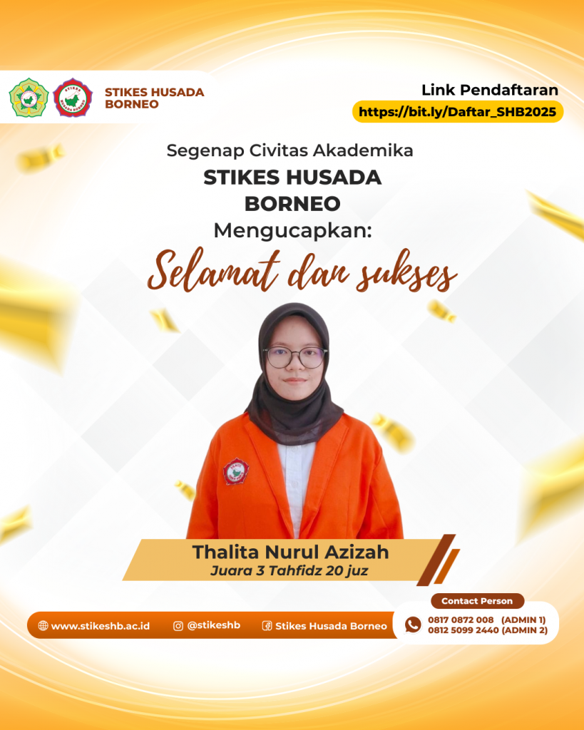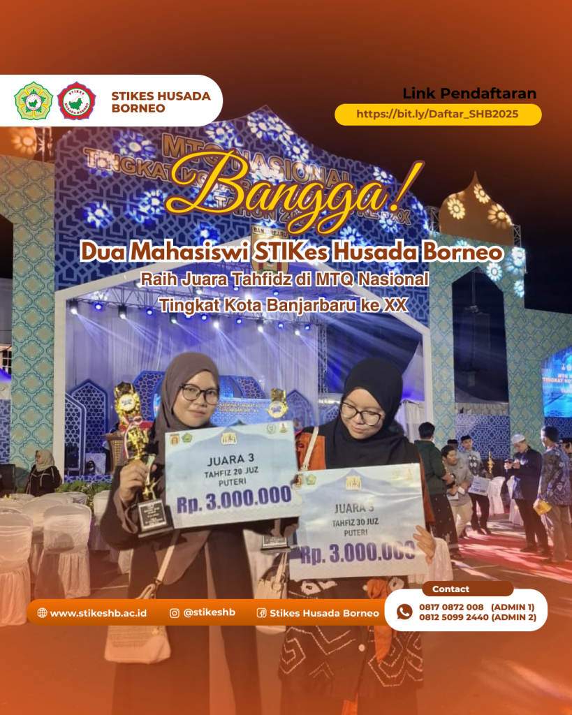 Segenap Civitas Akademika STIKes Husada Borneo mengucapkan selamat dan apresiasi setinggi-tingginya kepada dua mahasiswi berprestasi yang kembali mengharumkan nama kampus pada MTQ Nasional tingkat Kota Banjarbaru ke-XX. Dari Program Studi D3 Perekam dan Informasi Kesehatan Semester 5, Thalita Nurul Azizah berhasil meraih Juara 3 Tahfidz 20 Juz, sementara Sabrina Nurul Aisyah meraih Juara 3 Tahfidz 30 Juz. Capaian ini menjadi bukti dedikasi dan ketekunan mereka dalam menghafal dan mengamalkan Al-Qur’an.